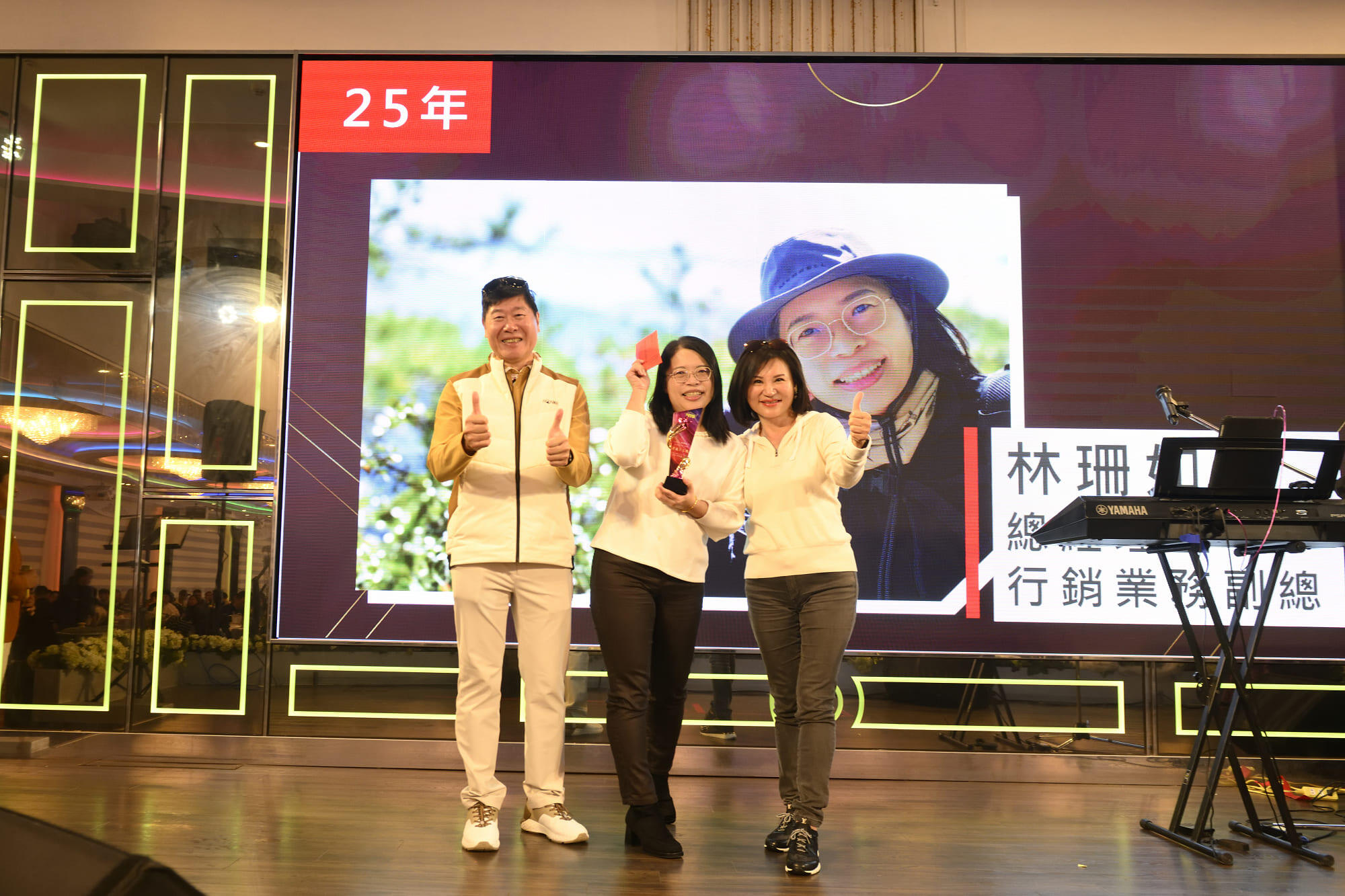 이날 저녁의 하이라이트는 10년, 20년, 25년 근속을 인정받아 고위 직원상을 수상한 9명의 직원에게 수여된 시상식이었습니다. 각 수상자에게는 감사의 표시로 기념 트로피와 상품이 수여되었습니다. 차이 회장과 린 부회장은 진심 어린 감사를 표하며, 이 특별한 날을 맞아 지난 한 해의 노고와 성과를 되돌아볼 뿐만 아니라, 이 굳건한 직원들의 헌신과 헌신에 경의를 표한다고 말했습니다. 크고 작은 모든 노력은 우리가 깊이 소중히 여기고 감사하는 것입니다.